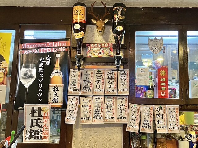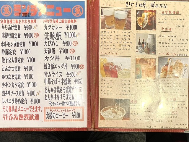 独創中華の始まりは、ホルモン豆腐。ありそうでなかった組み合わせで、絶品ものの味わい。焼豚エッグは、敷き詰めた肉に卵が3個というゼイタクな仕上がり。レバニラ炒めは、何とウスターソース味。コレがまた、よく合う。鶏天と豚天はフツーだけど、山盛り状態。茹で餃子は、山椒を効かせたタレとの相性がいい。