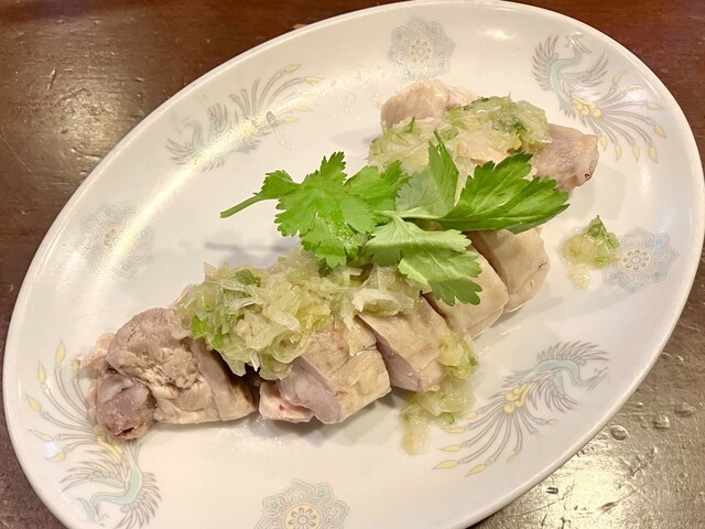 注文は、リピーターさんにお任せで。骨付き肉をブツ切りにした蒸し鶏は、ネギ塩味でいきなりの食べ応えアリ。ニラのお浸しは、卵黄で和えると甘味が重なってくる。蒸し春巻は海老入で、餡の旨味と合う。焼き餃子は、餡の旨味と焼き加減の絶妙さが三宮で上位レベル。