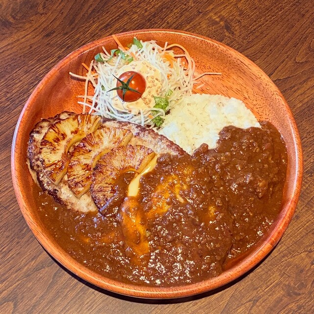 カレーで隠れて見えないけれどお皿の下半分は縁までハンバーグ!カレー少し辛くなった?(たぶん気のせい)このサラダがいいのよね〜それにやっぱりパイン最高!楽しい満腹ランチです。+170円でミニソフトもつけちゃいました。少しずつメニューは変化しますがずっと好きなお店です。