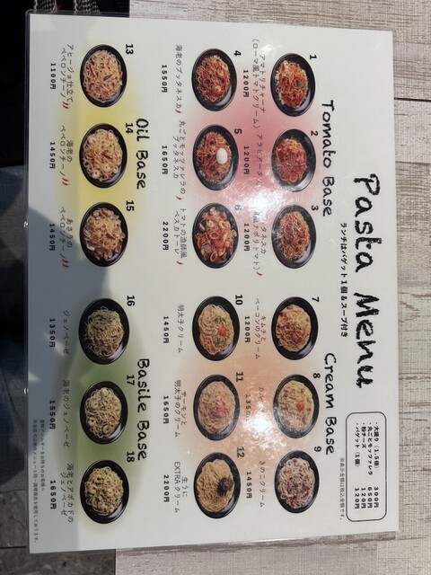 トマトベース、オイルベース、バジルベース、そしておすすめパスタもうまそうだったぞ!