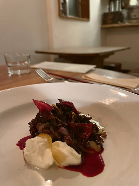 肉料理は、蝦夷鹿のワイン煮込み、ローゼル、トレビスも一緒に入っており、自家製バターを使ったソースも美味しかったです◎