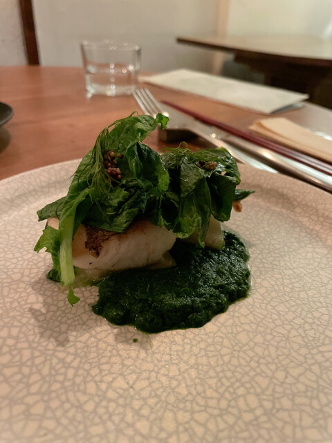 魚料理は、鯛のロースト。塩麴漬けされた蕪が下に敷かれており、春菊のペーストソースと絡めていただきました。