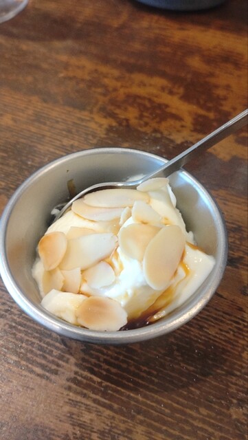 食後のパンナコッタは、滑らかでスライスアーモンドのアクセントが◎でした。