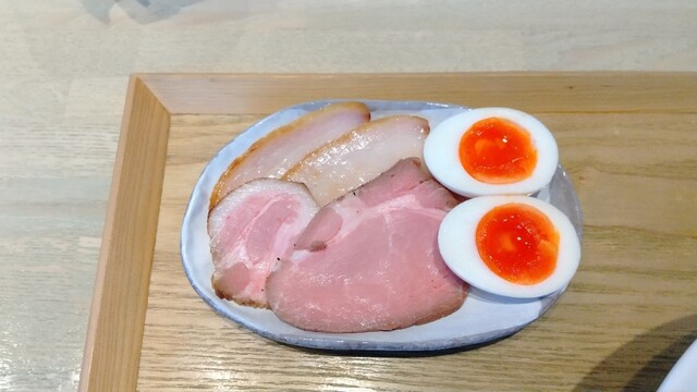 別皿に特製トッピングの味玉、チャーシュー2種類(低温調理豚肩ロースチャーシュー2枚、炙り豚バラチャーシュー2枚)が入っています♪