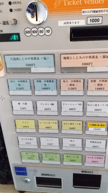 2時間ちょっと経過してやっと次の順番で店内に入れる所で、店員さんに先に食券を買うように言われて、店内に入り券売機のメニューを見て『特製 宍道湖しじみ中華蕎麦(塩) 1,250円』と『おみやげ中華蕎麦 800円』の食券を買って、店員さんに渡しておみやげ中華蕎麦は醤油をお願いして、また外で待ちます♪