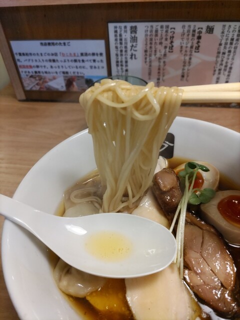 鶏油が表面に張って有り、鶏の上品な味わいの有る醤油スープで美味しいですね(˶ᐢᗜᐢ˶)♪♪