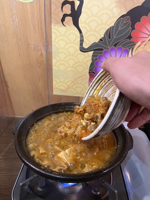 途中で鍋とコラボり、牛と豚のマリアージュがこれまた。