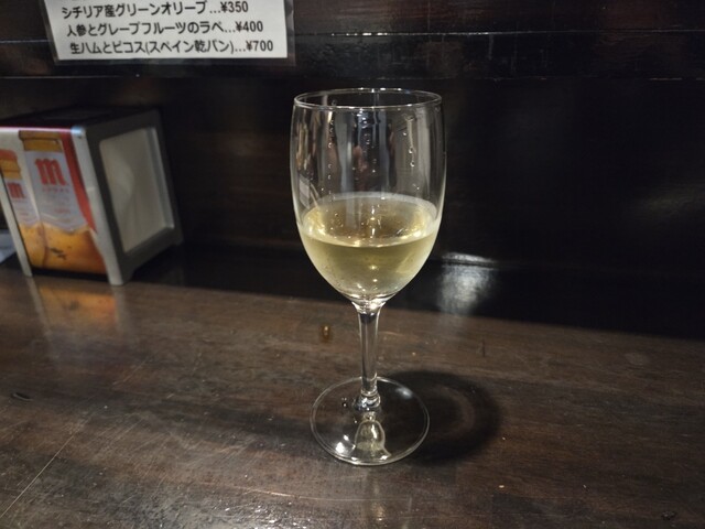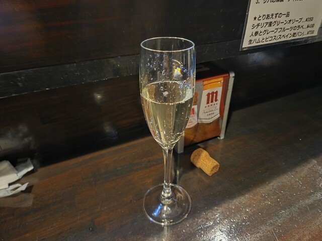 カウンターの一番奥に腰を下ろし、まずはスパークリングワインでスタート。