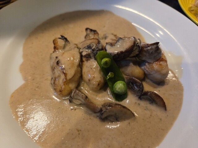 ワインはリースリングをグラスで。合わせて、白ワインに合いそうな牡蠣のソテー マッシュルームソースを注文しました。濃厚なマッシュルームソースが、プリッとした牡蠣の旨みを一層引き立て、とても完成度の高い一皿。