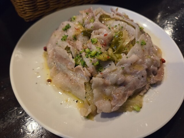 お料理は、春キャベツと豚肉のアンチョビ蒸しをオーダー。蒸されたキャベツは、豚肉の脂とアンチョビの旨みをしっかり吸っていて驚くほど甘く、これはぜひ食べてほしい一品です。