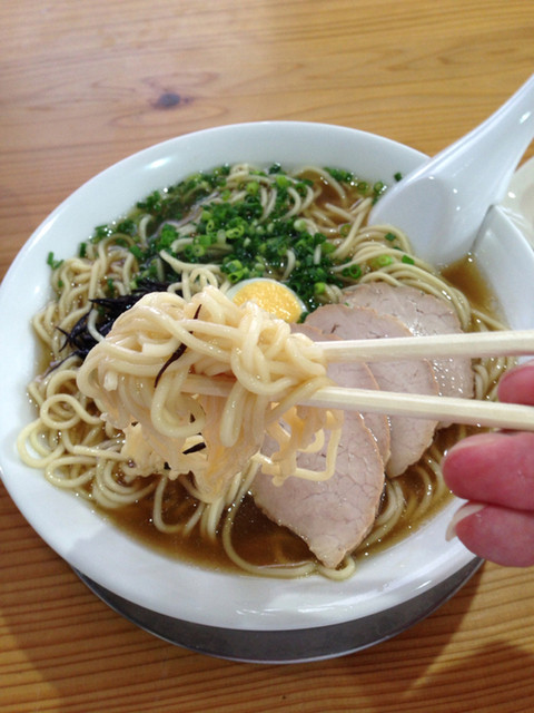 ストレートの中太麺、チャーシューは面積は広いがチョット脂少な目。