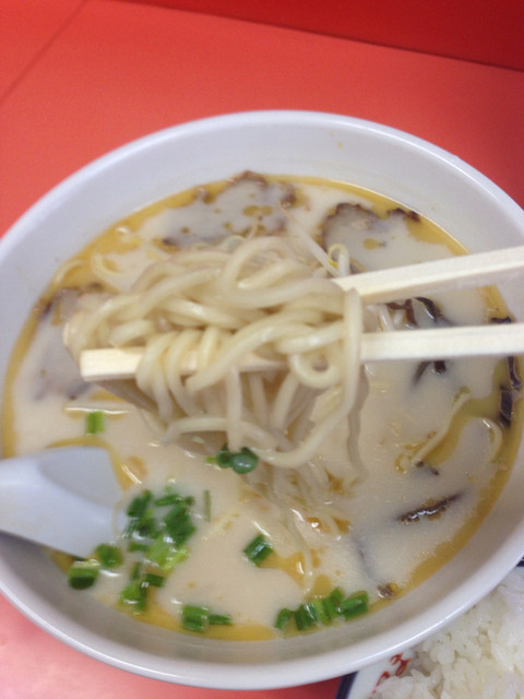 ラーメンは白濁のサッパリ豚骨に油が少々。めんは中太のストレート麺。
