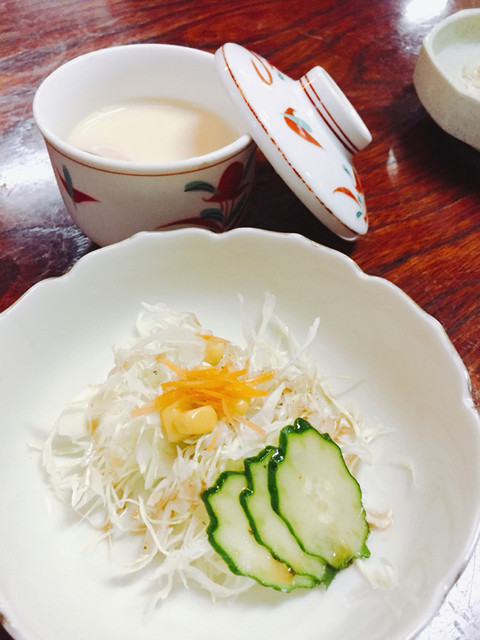 海鮮ちらしにはミニサラダ・茶碗蒸し・赤だし・デザートでしたが茶椀蒸しが「温泉たまご」になっておりました