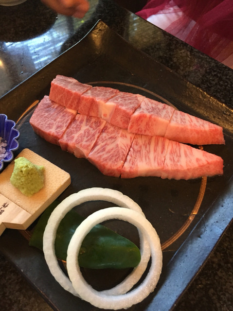 ステーキはさすがA5・A4の肉。綺麗なサシが入ったステーキ肉をわさびと塩でいただく