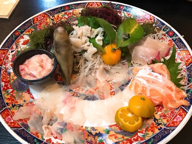 始めに運ばれた刺し身は、鯛に白身、タコ、エビ。