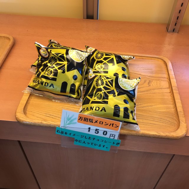 万田坑の石炭をイメージしたチョコが入った万田坑メロンパンがあります!
