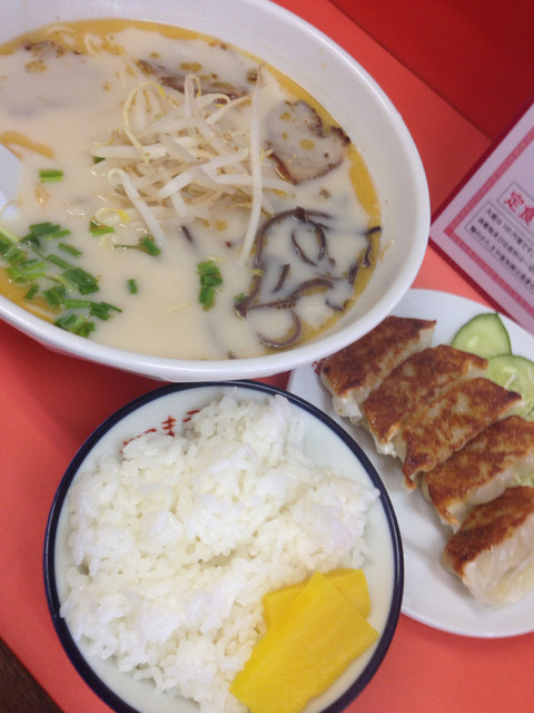 ラーメンは白濁のサッパリ豚骨に油が少々。めんは中太のストレート麺。