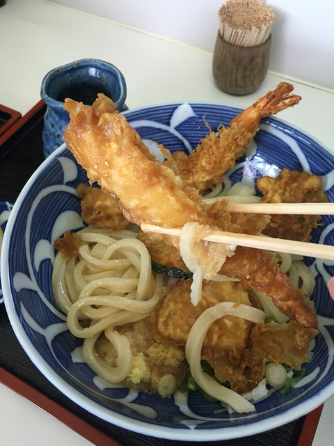 アツアツのエビ天や野菜、角が立ったうどん麺がコシの強さを物語っております。