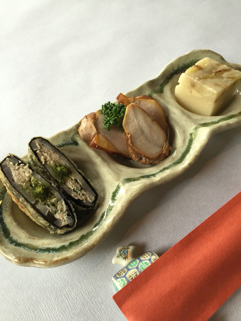 前菜は3点盛りから始まります、今回は「キジのレンコンはさみ揚げ」「キジの燻製」「玉子の巾着」と毎回チョットづつ変わります。