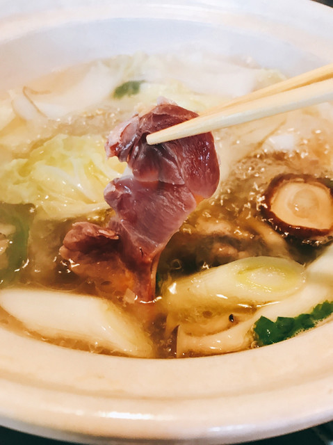 野菜に火が通ったころに、キジのモモとムネに分けられた肉をしゃぶしゃぶよりチョイ長めに投入!