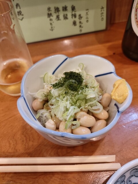 みそ豆、青柳とほっき貝、焼き鳥、えぼ鯛の塩焼きを注文。