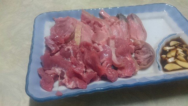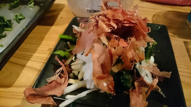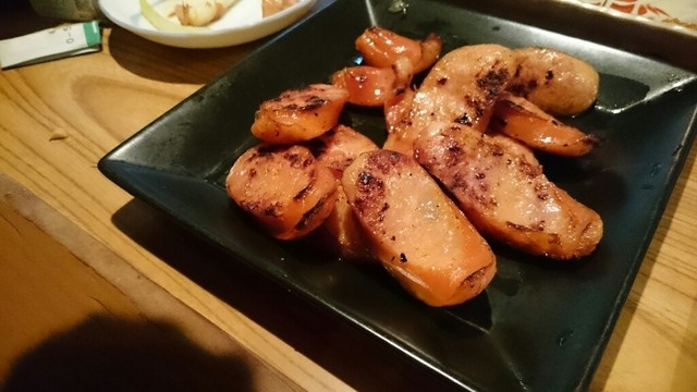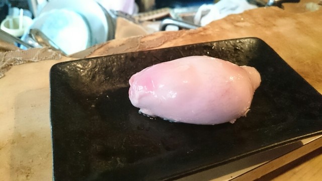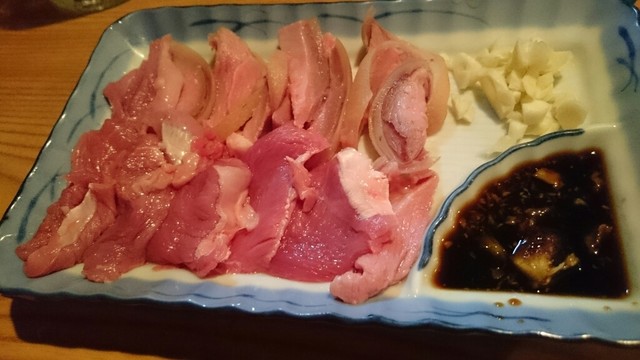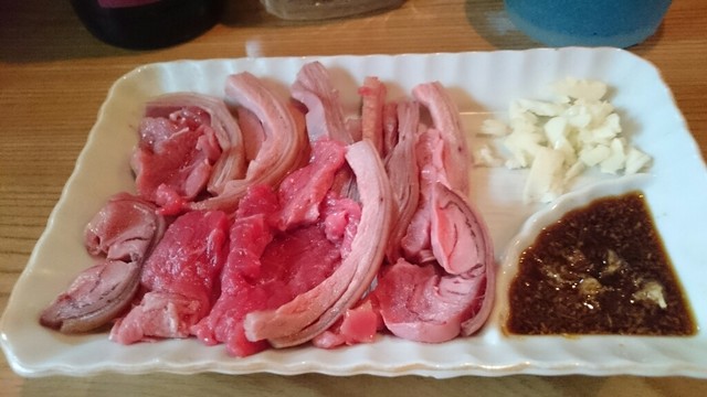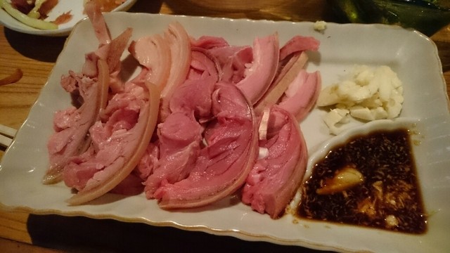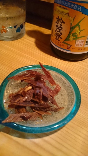 那覇に参りましたら、寄ります山羊屋さん。3時に参りますと、本日は5時から営業の貼り紙があり、6時半位に再訪問。カウンター席は、満席、座敷は予約済み。先ずは、於茂登のボトル2500円、山羊刺身1500円、島らっきょう500円を頼みます。玉ちゃんは、月数日のみ入荷とのことで、本日はありません。サービスのマグロ・ジャーキーで、ちびちび飲みます。山羊刺身は、一時間後ですが、やはり好きです。ニンニクがピリッとします。島らっきょうは、市販の品ですが、さらに30分。8時満席で、早めに辞めました。