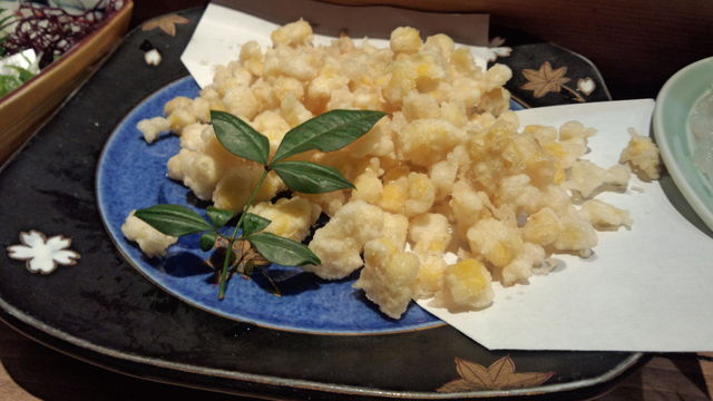 松山市大街道から2本西、三越の裏側にある瀬戸内海料理のお店。靴を脱いで、カウンター席に座ります。クーポン誌から、生ビール500円又はヒレ酒800円のプレゼント。ゴマ和えのお通しが良いです。本日のお勧めから、しめ鯖、オコゼを頼みます。値段不明。オコゼは、薄造り、骨、味噌汁のセットです。しめ鯖は早いです。オコゼ薄造りも揃います。肝、皮もあり、綺麗です。しっかりとした身です。トウモロコシ天を頼みます。これは、面白いです。ビールに合います。オコゼの骨の唐揚げが出ます。なす田楽も追加します。オコゼの味噌汁は、声掛けで、ジャコ飯を頼みます。ヒレ酒800円、つぎ酒400円。