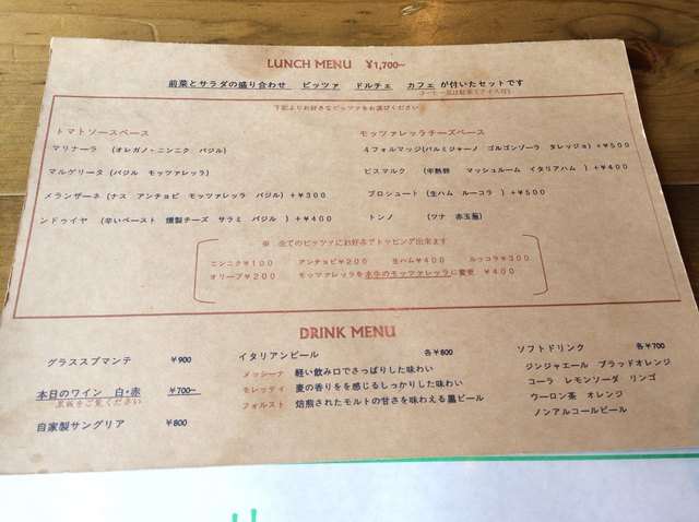 前菜サラダ盛り合わせ、お好きなピッツァ、ドルチェ、カフェ。基本が1700円、ピッツァの種類によりプラスα、トッピング別料金で可能。