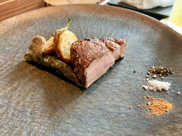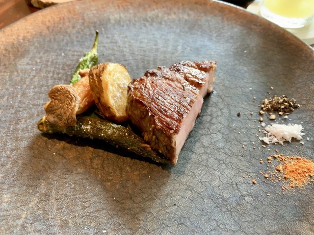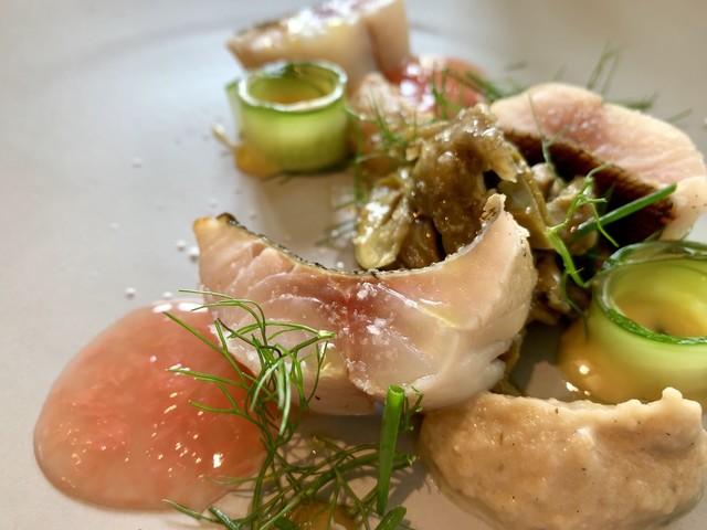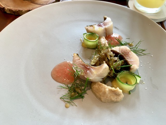 イサキの低温調理、皮目は炙り。秀逸。最近割と見かける焼きナスのペースト、ナスのマリネ、グレフルのソース、キュウリの中心に潜んだマヨネーズ風のソース、そのすべてがいい。お魚は山陰のお魚。安心ですね。