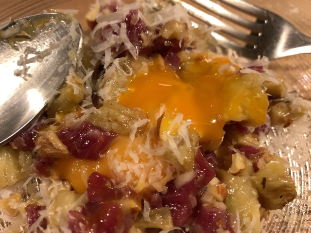 羊のタルタル 1600円 削ったパルミジャーノの下に鶏卵が潜んでいる