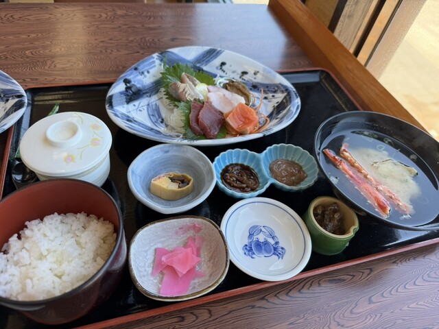 高足蟹一杯いくらとも書かれていない。(他の方が写真撮られてたのでたまたま自分が気づかなかっただけのようです)定食の中には高足蟹の足2本ついたセットとかが、並んでます。わからないので、年配のお姉さんにら話しを聞いたら、一杯単品だと22000円からで、特選高足蟹定食だと19800円で少し小ぶりの高足蟹がついて来るとの事、定食二人前。らしい蟹は一杯だけど二人前って、39600円かと思いましたが、ご飯、蟹の味噌汁、お刺身、茶碗蒸しの定食二人前と高足蟹一杯、全部で19800との事で、お刺身セットや茶碗蒸し二人前出して下さったのですが、一人でそんなに食べられないので、一人前下げて貰いました。さて茹で上がった高足蟹が目の前へ、デカッ