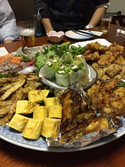 今日は刺身盛り合わせ、鯛の野菜蒸し、天ぷら盛り合わせ、若鶏のから揚げ、ごぼうのから揚げ、茶わん蒸し、湯豆腐、鉄火巻等々結構注文した。