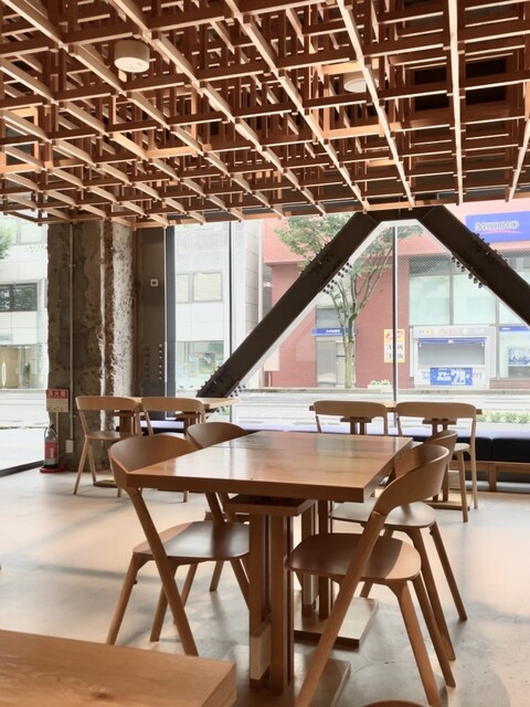 店内にいるといくらでも眺めるところがあって、窓の開口に対応したK型の鉄骨ブレスで、耐力と粘り強さが向上!鉄骨ブレスは店内にも使われていました。カッコいい〜!