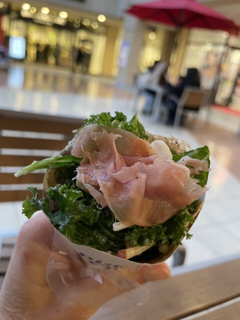 さらにレギュラーメニュー(比較的新しい?)はお値段少々高めですが、ハロウィンクレープに負けないほどのおいしさ!ケールと生ハムのそば粉ガレット!ドレッシングにナッツが入っていて最高でした。さらにクレープの底の部分はラクレットのような濃厚チーズ。こちらも美味でした。