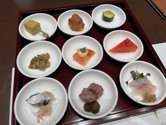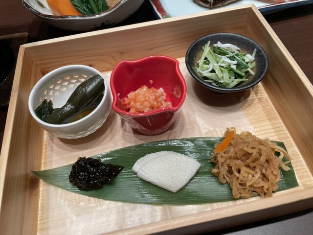 山菜きんぴら、鮭の麹漬け、岩のり佃煮、干し大根胡麻酢和え、お漬物、お浸し