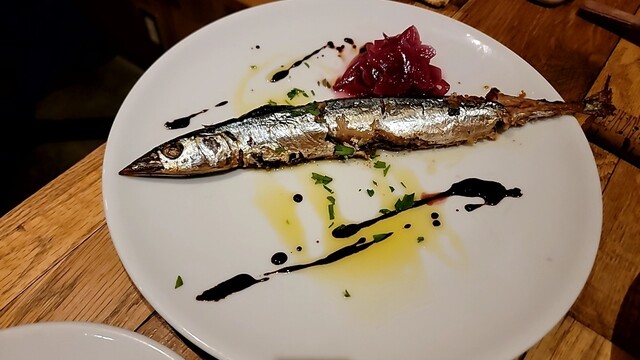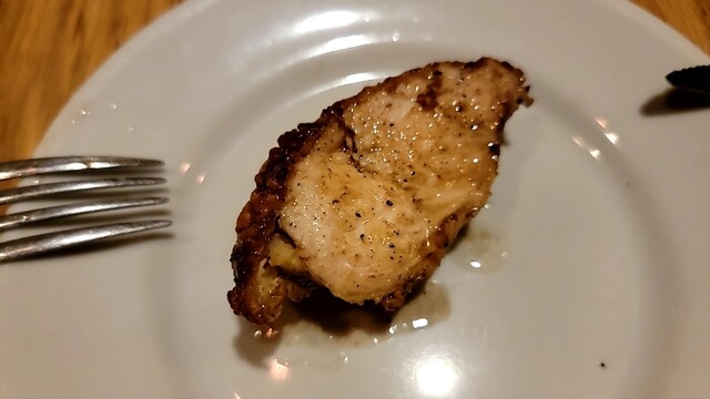 最初に前菜盛り合わせから提供。本日の前菜メニューを少しづつ盛り合わせた一皿で、一人前でこの量は凄いです。どの前菜もとても美味しく、連れと絶賛してしまいました。次に秋刀魚のコンフィが提供、こちらもまさかの秋刀魚丸ごとでびっくり!でも内臓や骨まで柔らかくとても美味。ピッツァも大きいサイズで2人共お腹がいっぱいになってきました。でも最後に大山地鶏のレモンバターソースが気になりオーダー。こちらも胸肉ながら身がしっとりしており旨い!連れは最後にドルチェで締めくくり、私はワイン1本をあけてしまいました。