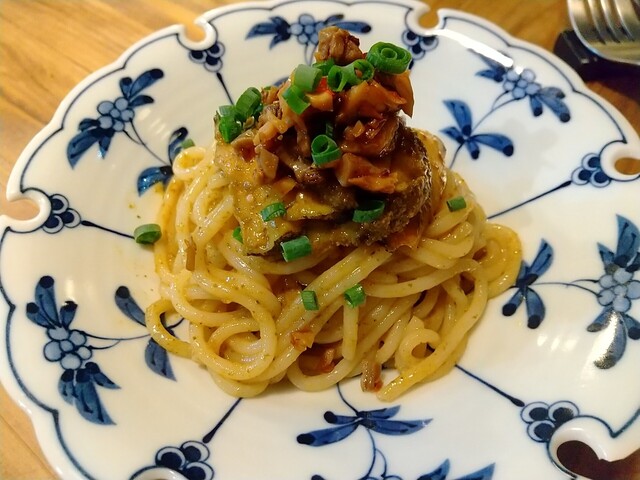 ★鮑の煮込み青唐辛子ソース、菜の花、猴頭菇、九条葱