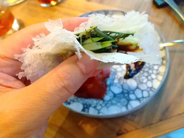 よだれ鶏、海老とマッシュルームのオーブン焼き、生シラスとコブミカン、豚と茄子の中華風天ぷら、フェンネル入り卵焼き、紹興酒の酒粕につけた枝豆