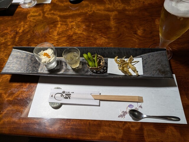 前菜、左奥の鯛白子ムース絶品