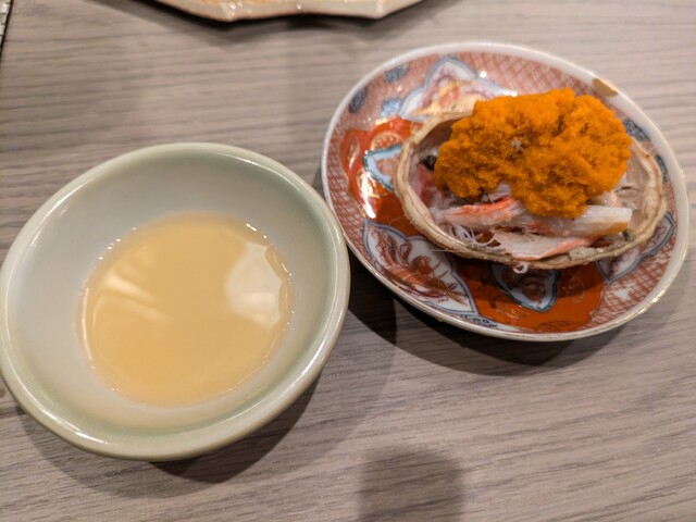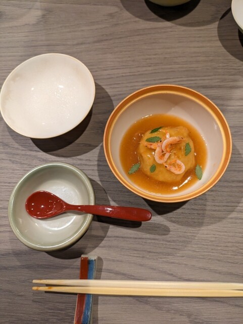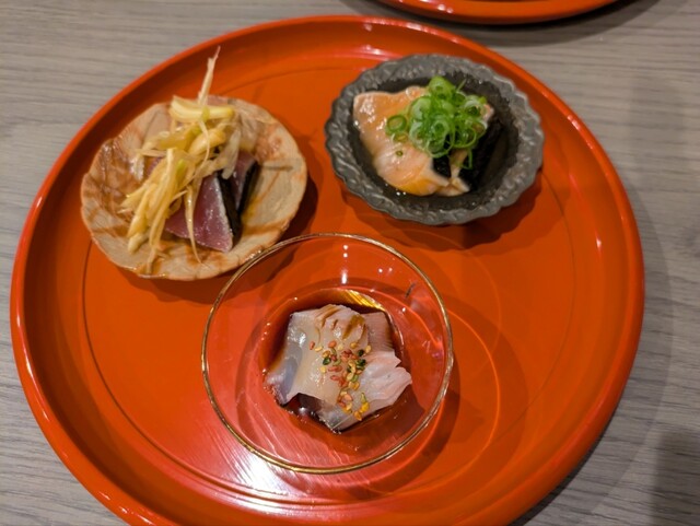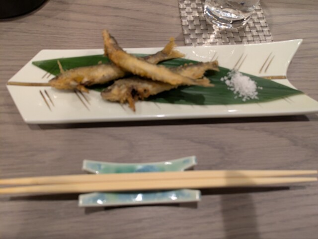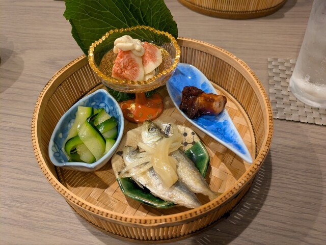 アオサの茶碗蒸しとイカのぬた和え、メヒカリの唐揚げかな?豆腐のみそずけ
