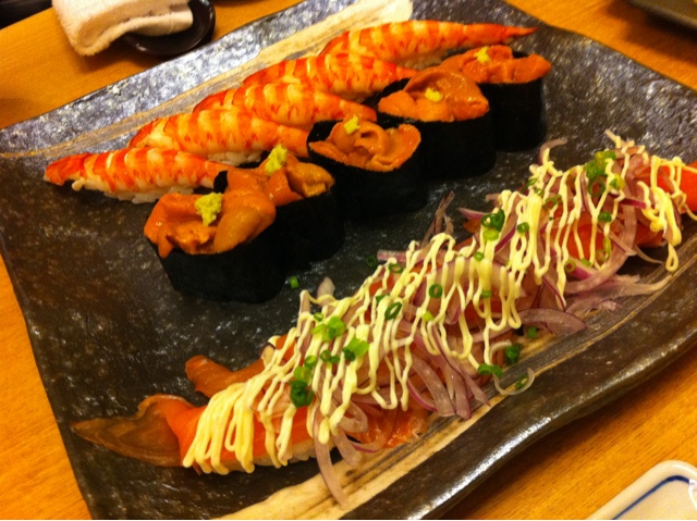 オムレツ風に卵にご飯が包まれていてネタと一緒に頂きます。