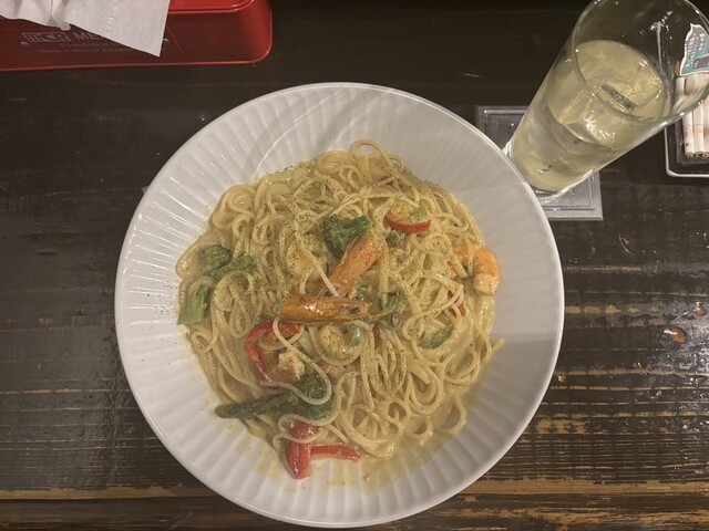 【注文】 グリーンカレーパスタ(辛さ増し・超大盛り)、ハイボール