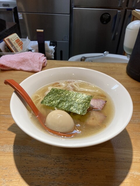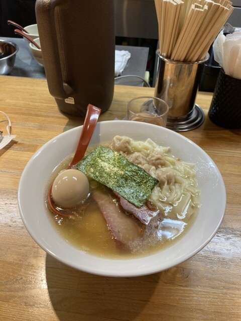 お願いしなのは、しおワンタンの味玉で味薄めです。作る順番の関係で1グループあとになり7•8分で提供されます。