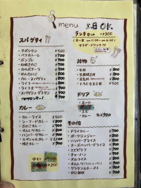 1時半近くだったので空いてました。お好きな席へと案内されます。お願いしたのは、スパゲティのライフで300円をプラスしてランチセットにしてもらいます。
