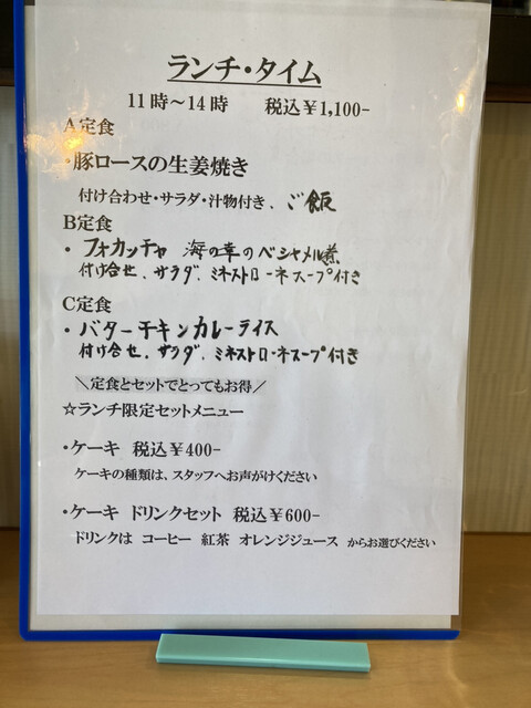 今日は家内を連れて来られました。今日も美味しそうなメニューが並んでいます。たまには定番に行こうかと思いながら来たけど、メニュー見たら迷いが出てきました。結局、私はBランチを、家内はCランチを、お願いして家内にはケーキセットを私はコーヒーを追加しました。