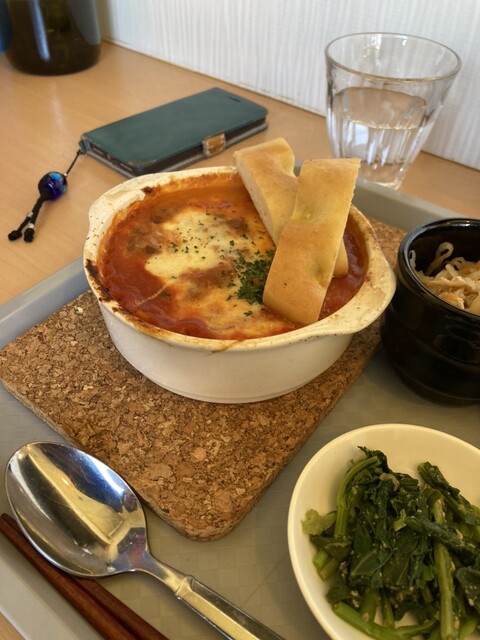 Bランチをお願いしました。初めての料理です。マスターにお伺いしたら、イタリアの料理だそうです。パンに具材を乗せ焼くのだそうです。焼き加減が難しいのでアレンジされているそうです。