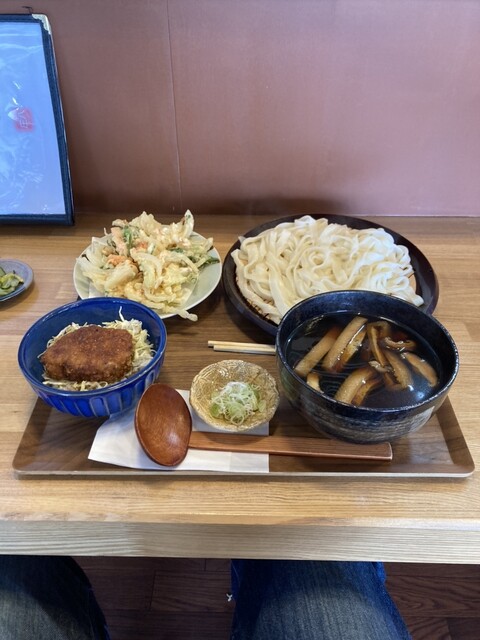 お願いしたのは、庄八うどんとミニミニソースカツ丼です。さっそくお通しがきます。ミニサラダと里芋の煮物と漬け物です。里芋の煮物が柔らかでいい味です。美味しいー サラダはもう少し欲しいカナー お通しを、食べ終わり5•6分でうどん類がきました。