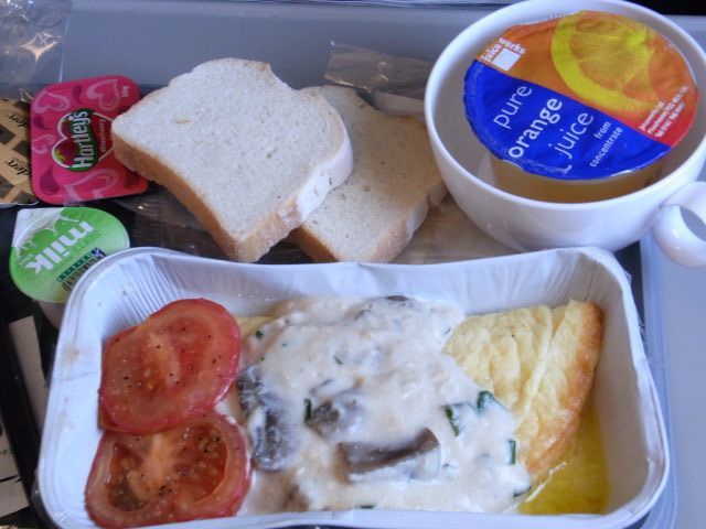 あらかじめ機内食のチョイスができなかった短距離の路線の機内食は、どうなんだろう? という興味から「ベジタリアン。」と言ってみたら、オムレツ(トマト&マシュルームの入ったクリームソース添え)でしたよ。