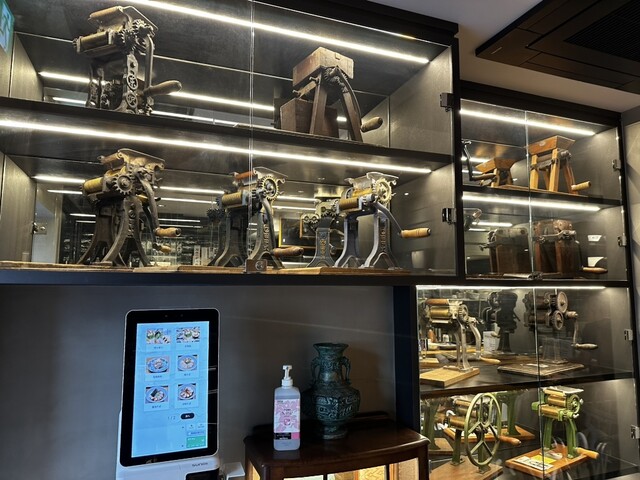 店内入り口付近には券売機と、ミュージアムのようにズラリと並んだ様々な製麺機