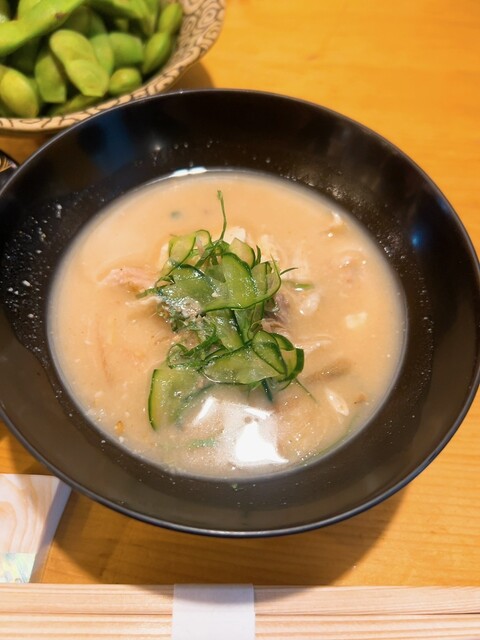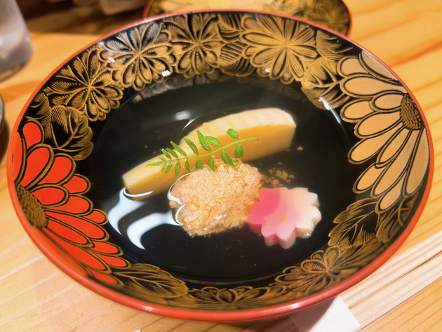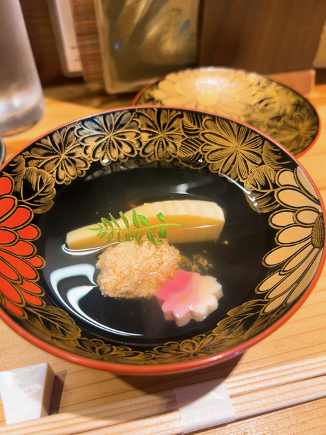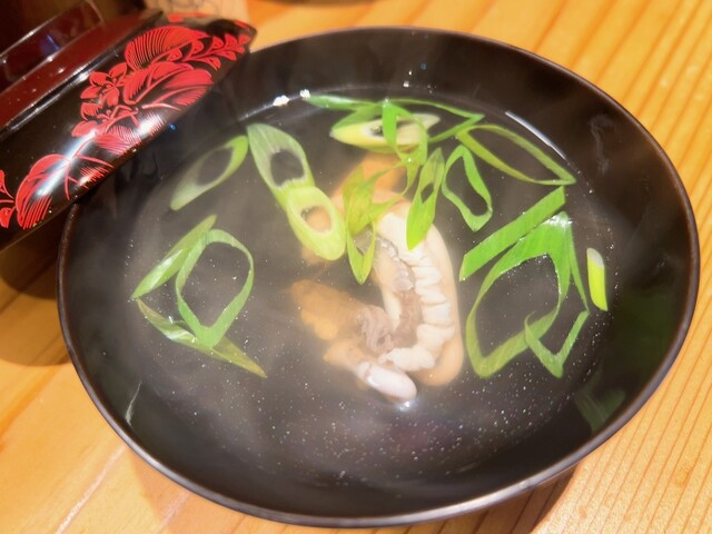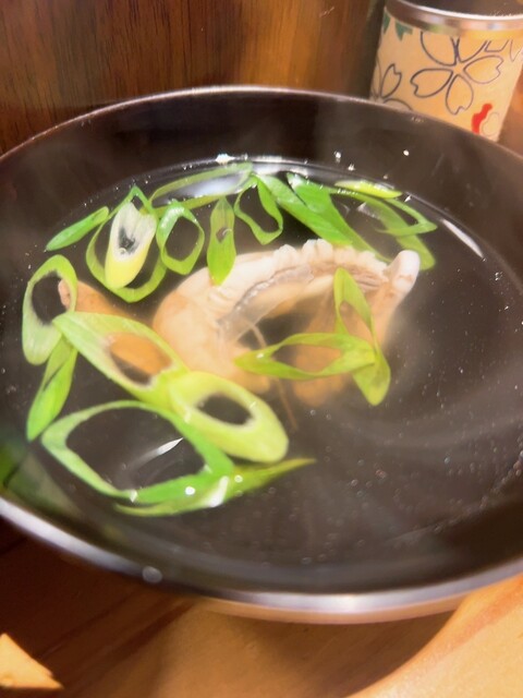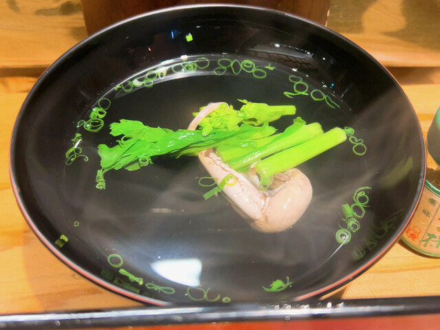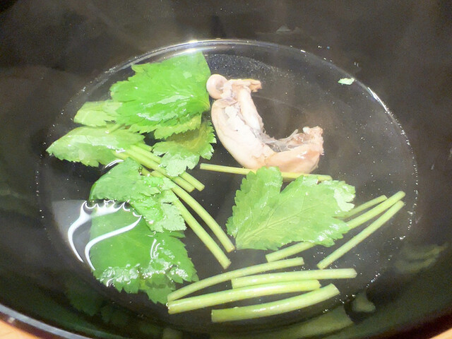 本日のお通しは、鴨団子に焼きアスパラのお吸物